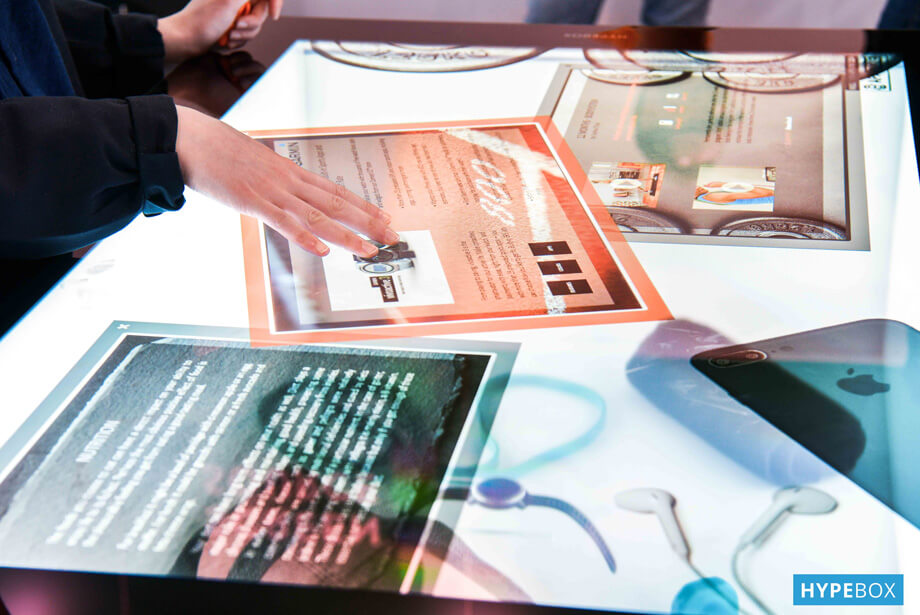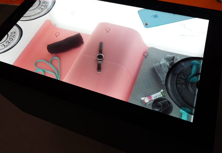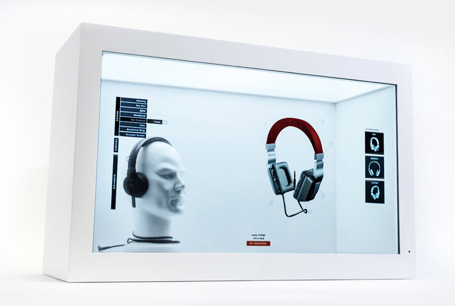 Die Produktpräsentation der Zukunft schon heute erleben: Zeigen Sie interaktive digitale Informationen auf einer virtuellen Ebene gleichzeitig direkt über dem Produkt, das sich hinter dem transparenten Touchscreen befindet.